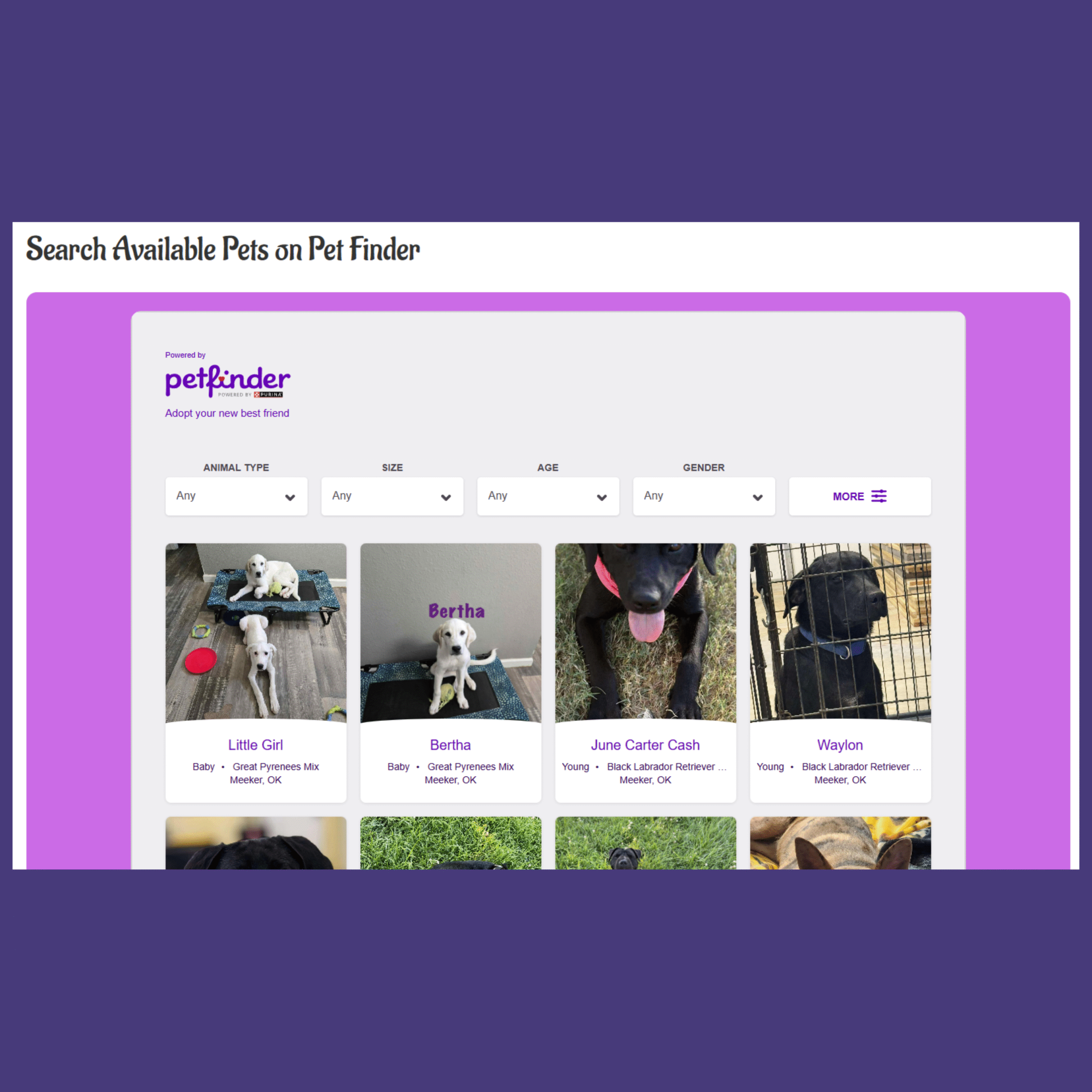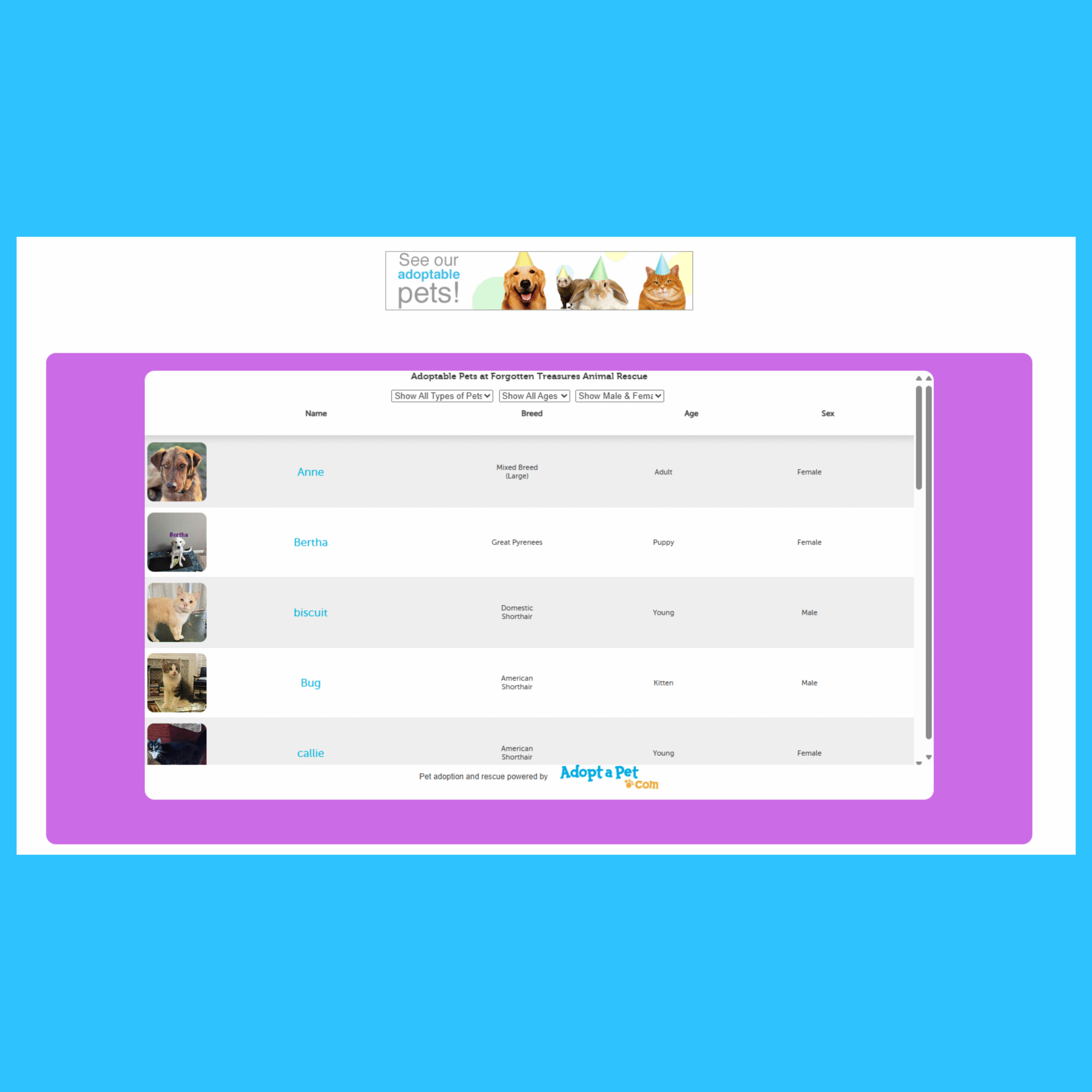 Petfinder and AdoptaPet widgets embedded to display real-time animal listings