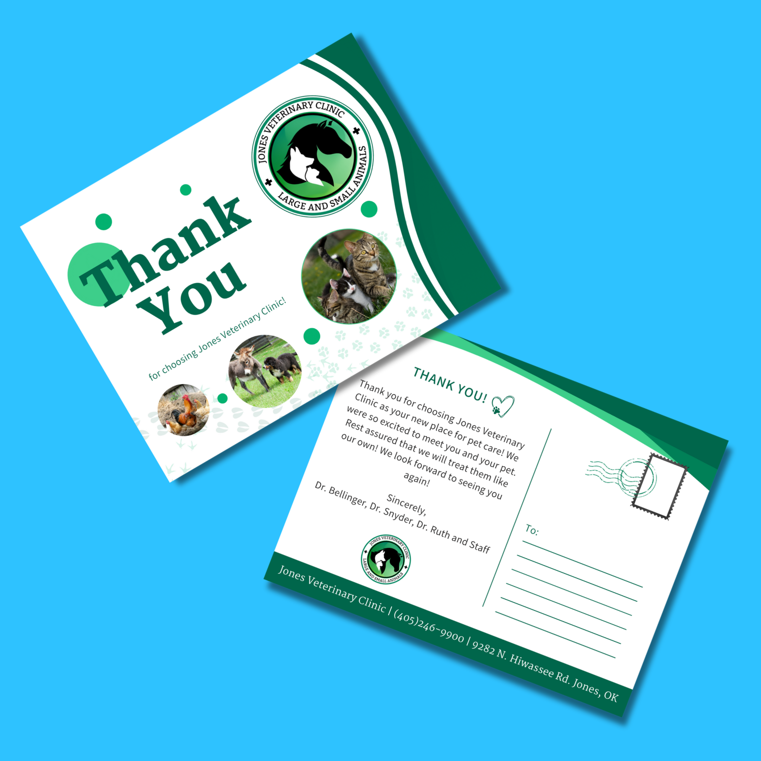 The project resulted in a strong, cohesive brand presence across digital and print platforms, helping Jones Veterinary Clinic quickly establish credibility in their new market. Within the first 60 days of launch, the website received steady traffic and multiple form submissions for appointment requests and prescription refills to help staff answer questions automatically. In their first year, the clinic gained over 1,000 Facebook followers, received more than 9,000 website page views, and their Google Business Profile reached over 5,000 people. Clients used the online store links and navigated the site with ease.