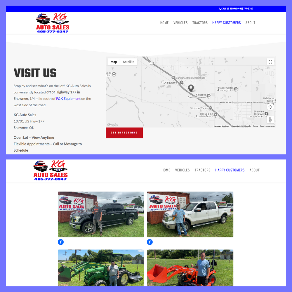 Within the first week of launch, KG Auto Sales began receiving more visibility and traffic across its website, Facebook Page, and Google Profile. The streamlined workflow allows staff to publish listings quickly, while a custom function ensures every vehicle post includes a consistent, SEO-optimized title. The addition of a Happy Customers gallery with built-in social sharing has encouraged user engagement, and the embedded Google Map has improved location clarity for in-person visits. With automated social posting, real-time analytics, and scalable systems in place, KG Auto Sales now operates from a professional digital platform built to grow with their business.