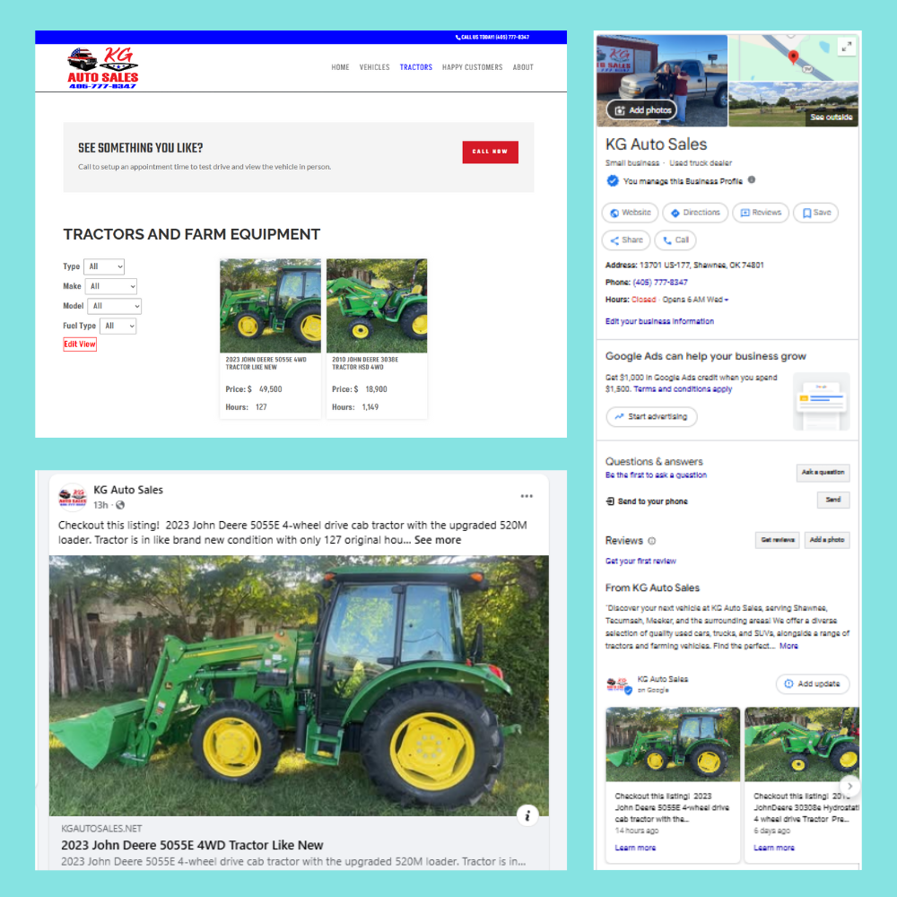 KG Auto Sales had no digital presence, listing vehicles only on Facebook Marketplace. Webspinups created a Google Business Profile, Facebook Page, and a website with dynamic vehicle listings, custom fields, searchable templates, and automated social posting, giving the business visibility, control, and room to grow.